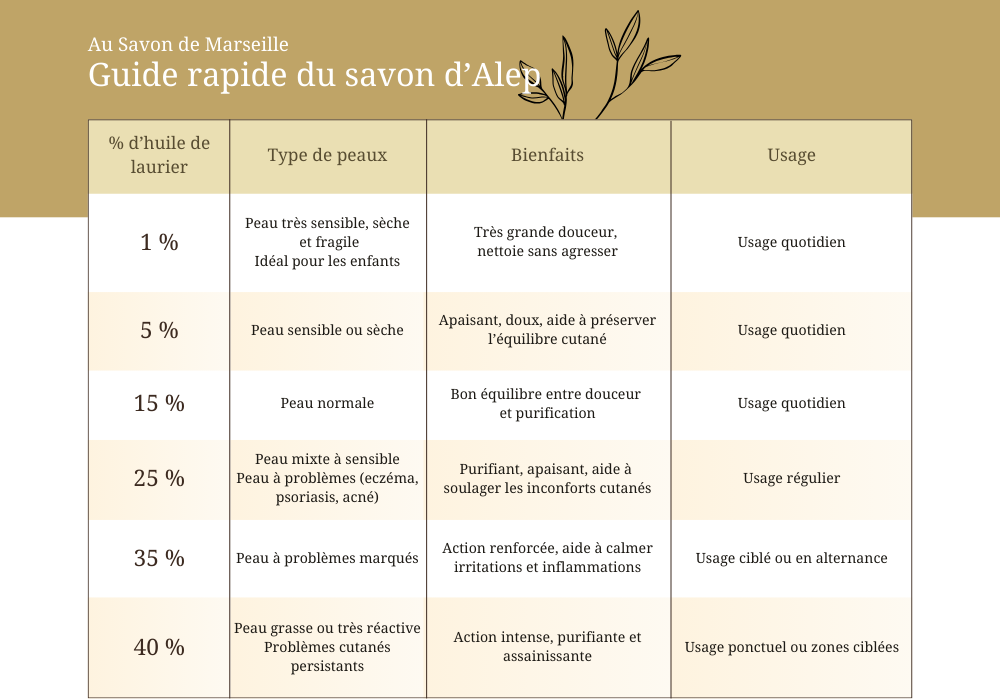 Pour les peaux sensibles, sèches ou réactives, privilégiez un savon d’Alep faiblement dosé en huile de baies de laurier (1 à 5 %).