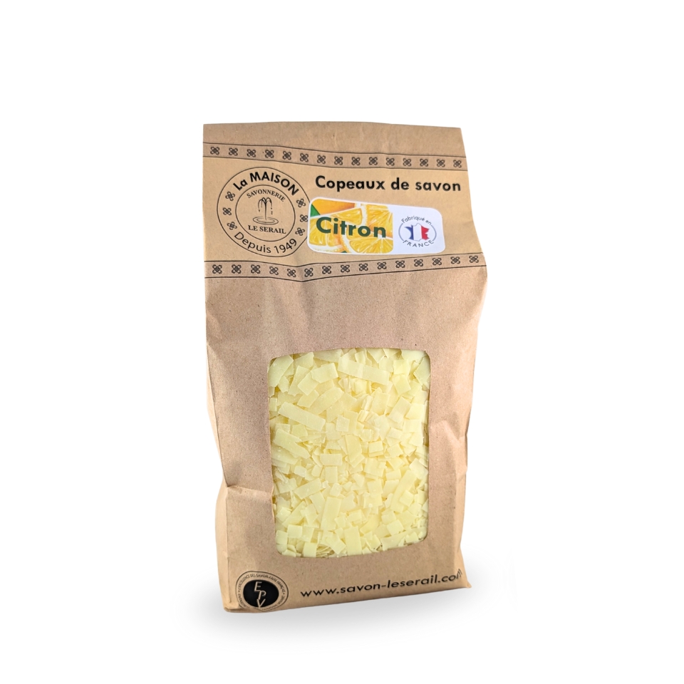 Marseille soap already grated into shavings made by the Le Serail soap factory for hand washing or making your own lemon-scented laundry soap.