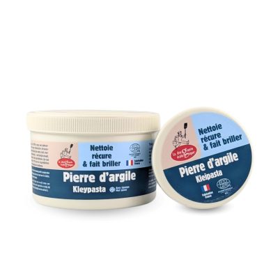 Claystone is a multi-purpose cleaner for hard, water-washable surfaces and can, in most cases, replace many conventional household cleaners. The clay stone cleans in depth, by removing dirt, all smooth surfaces such as plastics, PVC, leather, enamel, tiles, stone, lino, glass, mirror, stainless steel, aluminum, silver, silverware, pewter, brass , copper, chrome…, all without scratching and leaving a slight satin finish. It comes in the form of a semi-hard paste. Its use is particularly economical.