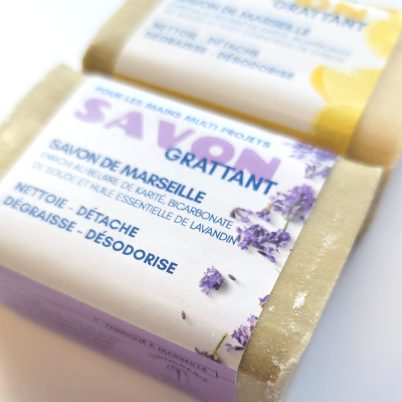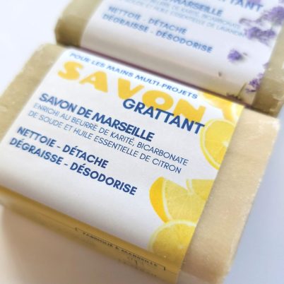 Un savon de Marseille à l’huile d’olive enrichi de beurre de karité, de grains de bicarbonate et huile essentielle ; une barre lavandin et une barre citron.