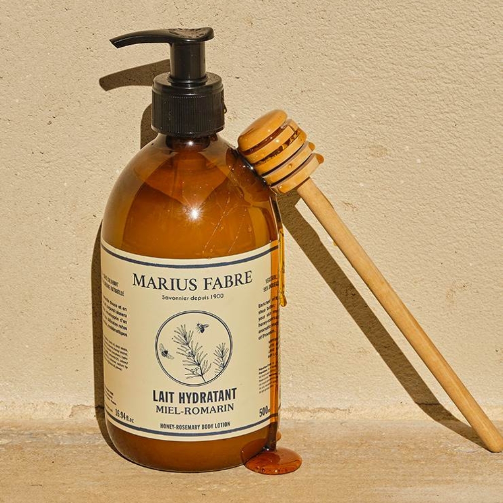 Lait de corps hydratant Miel-Romarin de Marius Fabre, un soin corporel qui combine efficacité hydratante et plaisir sensoriel dans une formule simple, naturelle et composée à 98 % d’ingrédients d’origine naturelle.